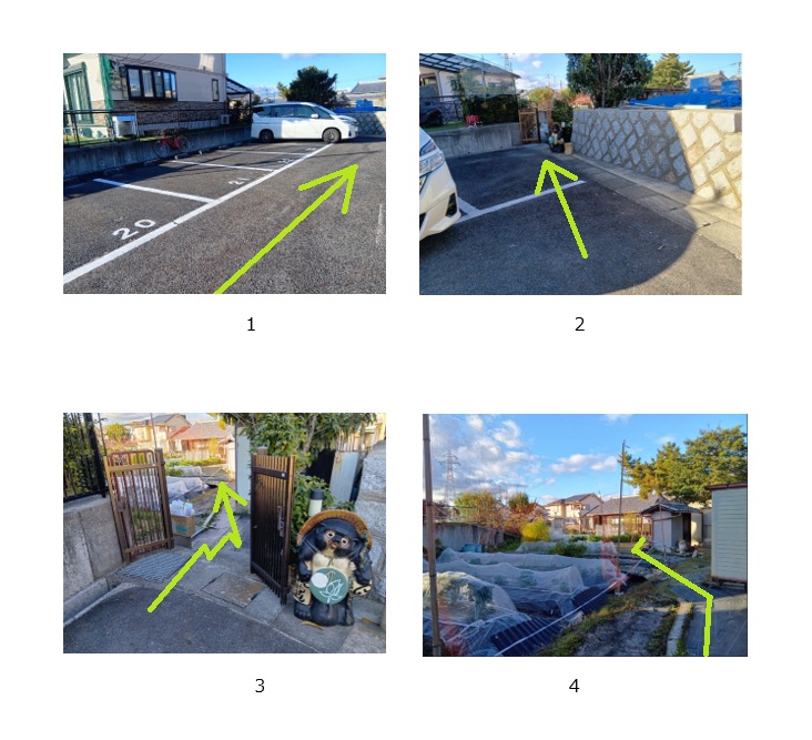 駐車場24番奥のタヌキの入り口から入って、畑を左手に見ながら進んでください