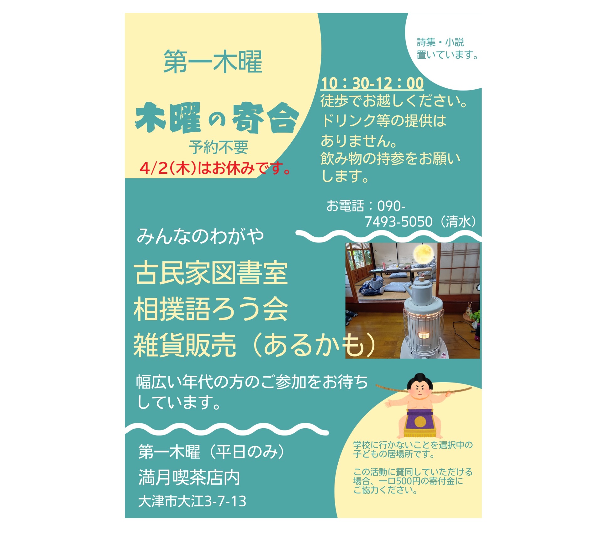 イベントの開催場所は、瀬田駅から徒歩15分の大江3丁目、満月喫茶店内です。